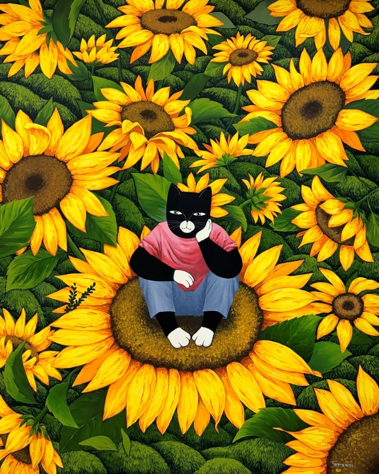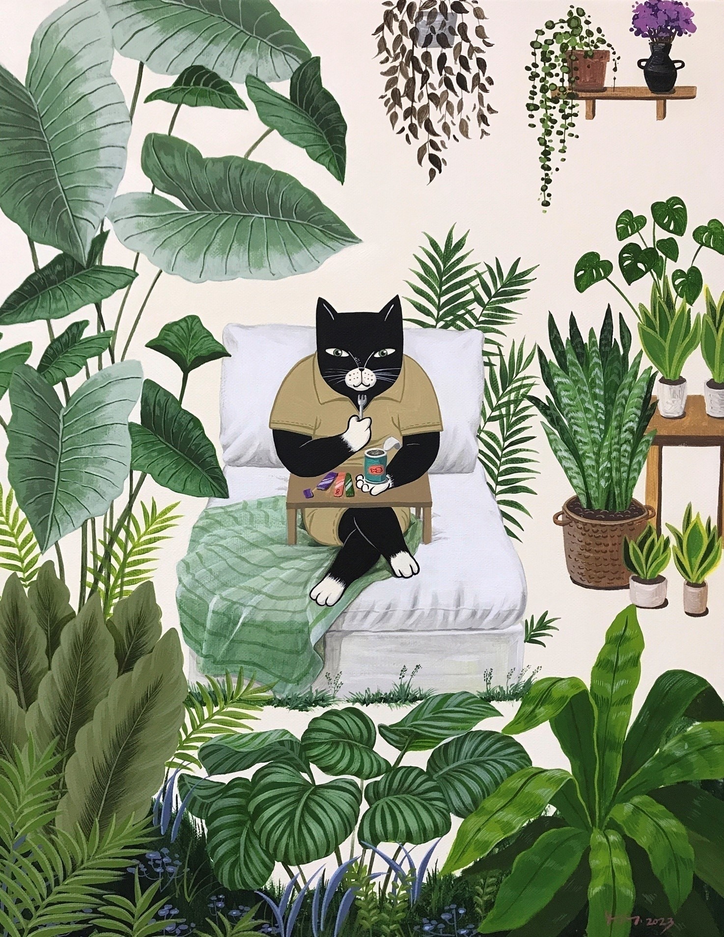 개인전 2024 초대개인전, 도슨트갤러리, 김해진영 2024 초대개인전, 파티마병원갤러리, 창원 2024 초대개인전, 청담미엘, 서울 2024 초대개인전, 퍼블릭갤러리, 서울 2024 초대개인전, 코코앤켈리, 부산 2024 초대개인전, 퍼블릭갤러리x까페295, 서울 2023 초대개인전, 남명갤러리, 김해 2023 부스초대개인전, 갤러리원, 롯데백화점 창원점 2023 부스초대개인전, 도슨트갤러리, 김해 단체전 및 아트페어 30여회 이상 2024 어반브레이크 서울 2024 비비드 기획전, 휴갤러리 2024 경남국제아트페어 2024 울산국제아트페어 2024 조형아트서울2024 2024 서울 온 김해, 김해청년작가협회특별전, 인사아트센터 2024 부산국제화랑아트페어 BAMA 2024 From the Beginning, GALA ART CENTER, New York 2023 김해비엔날레, 도슨트갤러리 2023 어반브레이크x부산 2023 울산국제아트페어 2023 대구국제블루아트페어 2023 4인4색전, 갤러리 림해, 부산 2023 시각예술분야 불가사리프로젝트 ‘만남, 그 후’전, 윤슬미술관 2022~2024 아트가야 AGF아트페스티벌, 윤슬미술관 2022~2023 경남미술청년작가회정기전 ’ARTCOMBINE’ 2022~2024 김해청년작가협회 정기전 外 -작가노트- 봉다리군의 소소하지만 확실한 행복찾기 제가 그리고 있는 그림에는 봉다리군 이라는 검은 고양이 캐릭터가 등장합니다. ‘깜장 봉다리’ 라는 이름은’ 검은 봉지’의 경상도사투리입니다. 봉다리군은 제 자신, 또는 주변 인물들의 모습을 반영했습니다. 저의 그림 속에서 추구하는 큰 줄기는 ‘소소하지만 확실한 행복 찾기’ 입니다. 누구나 행복을 말하지만 봉다리군은 행복이 어떤 모양이며 어떤 맛이 나는지, 또 어떤 냄새가 나는지 구체적으로 알고 싶어 가까운 내 주변부터 하나 하나 탐색하고 있습니다. 우선 자신에 대해 알아가고, 좋아하는 것을 하나씩 하다 보면 행복에 더 가까워 질 수 있다고 생각합니다. 검은색인 봉다리군은 마치 크기도, 두께도, 모양도 정해져 있지 않은 무한한 블랙홀과 같습니다. 블랙홀 같은 멋진 색을 두르고 있으면서도 그저 어둡고 까맣다는 주변의 시선 때문에 자신이 얼마나 많은 별들을 품고 있는지 모릅니다. 봉다리군은 자신 안에 있는 무한한 가능성 느끼며 블랙홀처럼 멋진 고양이가 되고 싶은 꿈을 꿉니다. 봉다리군을 통해 저와 주변의 소소한 이야기들을 풀어나가며 유머, 신뢰, 따뜻함 등 다양한 감정들로 소통하길 희망합니다.