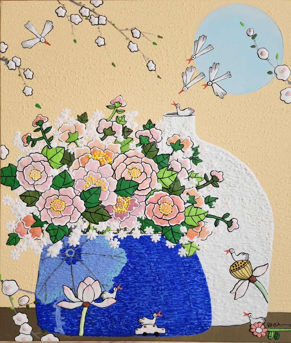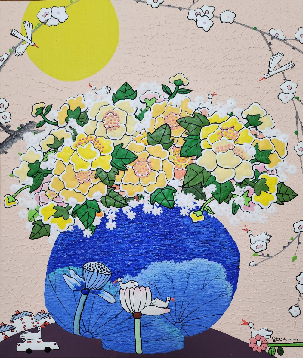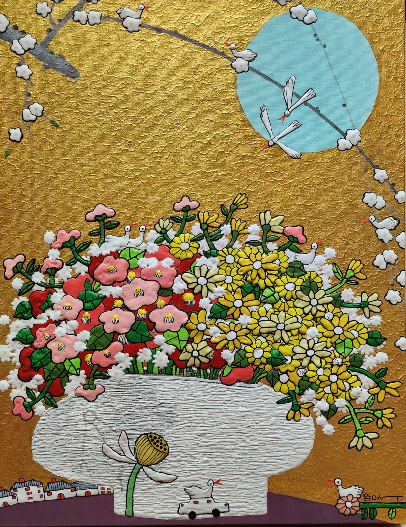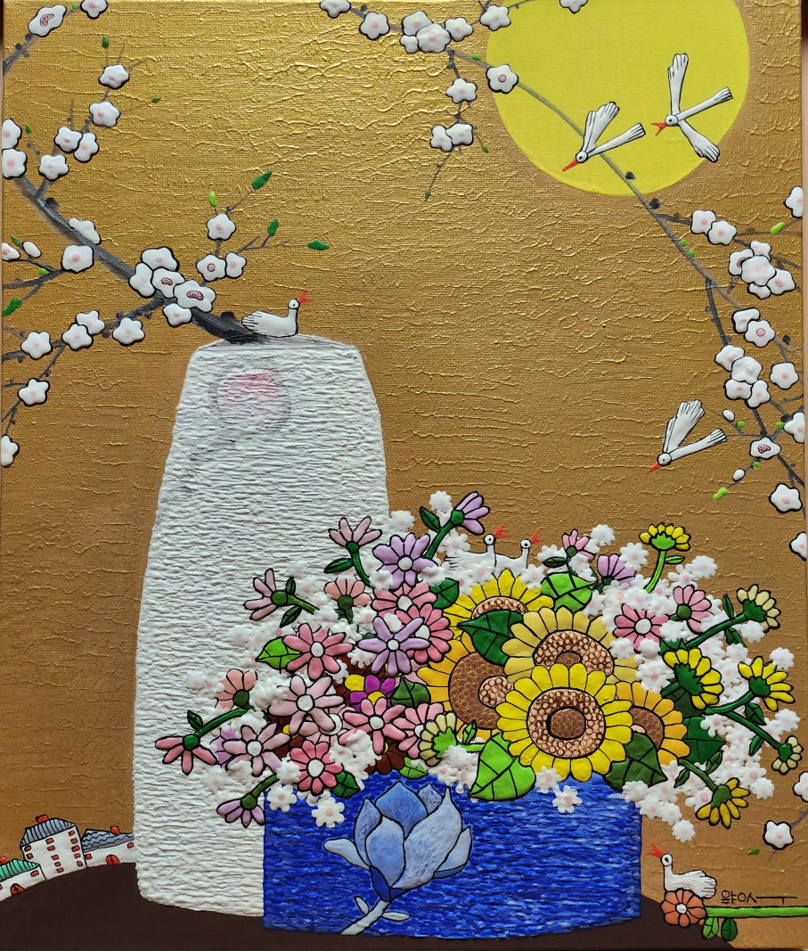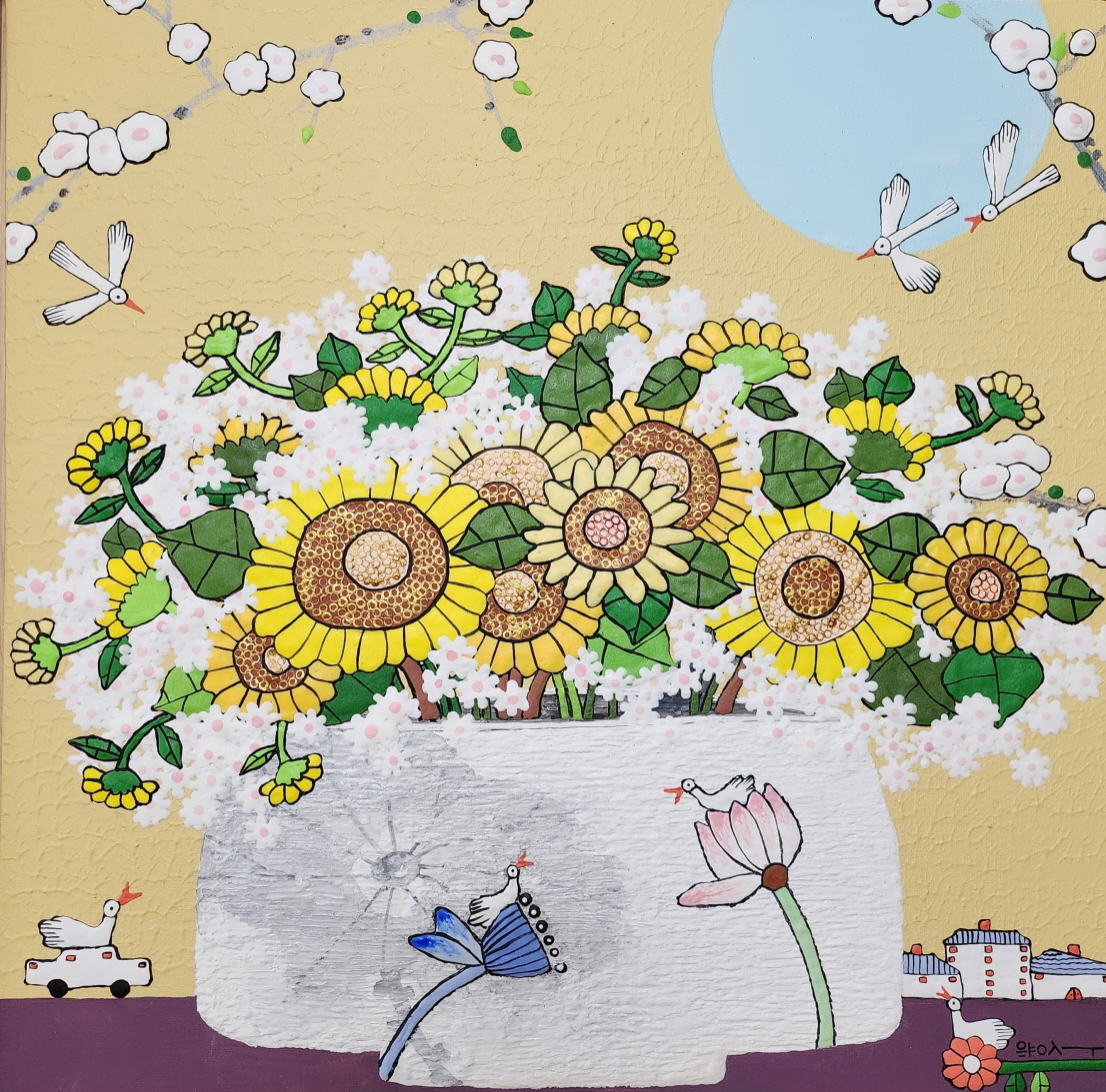 권향수 개인전 및 단체전 경력 <개인전및초대전>23회 2024 9월1일~30일 3s 갤러리 초대전 2024. 1월10 일~29일 돈화문갤러리초대전 2023.9월1일-9월30일 서울 3s갤러리 초대전 2023.5.1~5.31 고양시 백석 앨리 갤러리 초대전 2022 7.19~8.6하남시 갤러리베누스 초대전 2022..1.21~1.28서울아산병원초대전 2020.05 분당 보바스기념병원 초대전 2019.08 서울아산병원갤러리 초대개인전 2018.03 미국중앙일보 LA지사 Artcenter 초대전 외 단체전 다수 부산 대구 홍콩 프랑스 브라질 미국 인도 중국 국내외아트페어 다수 현대조형미술대전운영위원심사위원 경기미술대전운영위원및심사위원외다수 -작가노트- 우연히 밤하늘에 둥근달을 보게 되면 습관처럼 잠깐 소원을 빌게 된다. 어릴 적 보름날밤 가마솥 안 그릇에 쌀을 담아 촛불 켜시던 어머니의 정성이 고스란히 담은 깊은 사랑이었던걸 내 아이들을 키우면서 점점 더 닮아간다. 세상의 엄마들이 다 그러하듯이- 어머니의 눈빛이 내 얼굴에 담겨지고, 그 옛날 꿈꾸던 추억을 더 곱고 순박하게 표현하고 싶었다. 어머니의 둥근 달, 지천으로 피어있는 해바라기와 키 작은 꽃들- 착한 집들이 소담히 마주하고, 희망과 사랑을 노래하는 작은 새는 어쩌면 부부, 연인, 자녀 일수도.... 나의 그림은 인연이 되어 만나는 모든 사물들을 형상화하여 소박한 민화 느낌으로 단순하게, 자유롭게, 조금은 모자란 듯 표현하고자 했다. 어머니가 나에게 그랬듯이 내가 내 딸(아이들)에게 최고의 아름다움과 소중하고 귀한 행복한마음이 내 작품을 보는 사람들에게 한 보따리선물 되어 잠시나마 추억과 희망의 메시지가 전달되어 행복하고 여유로운 미소가 번지기를 소망해본다.
