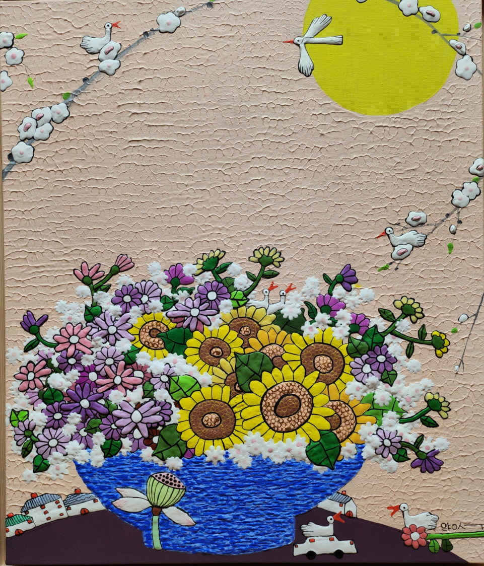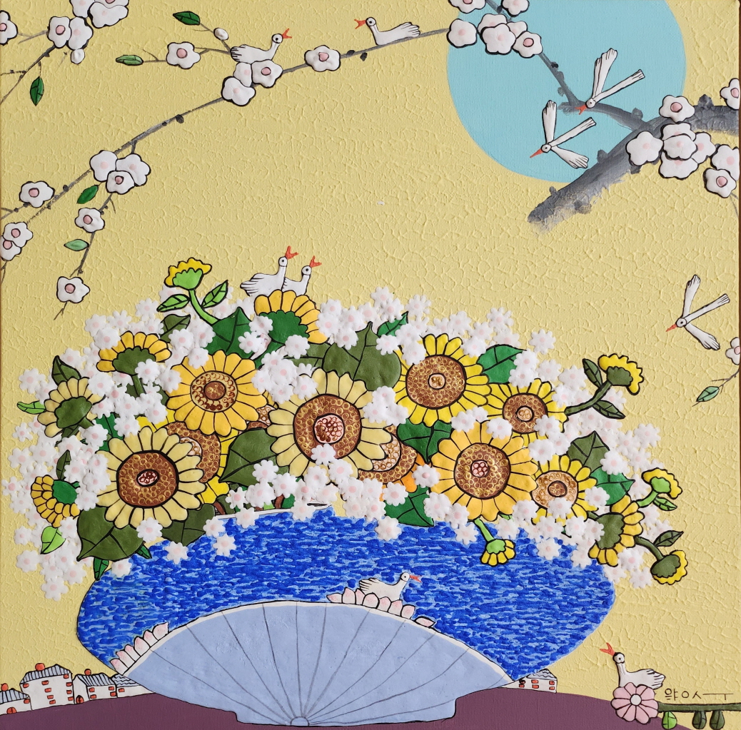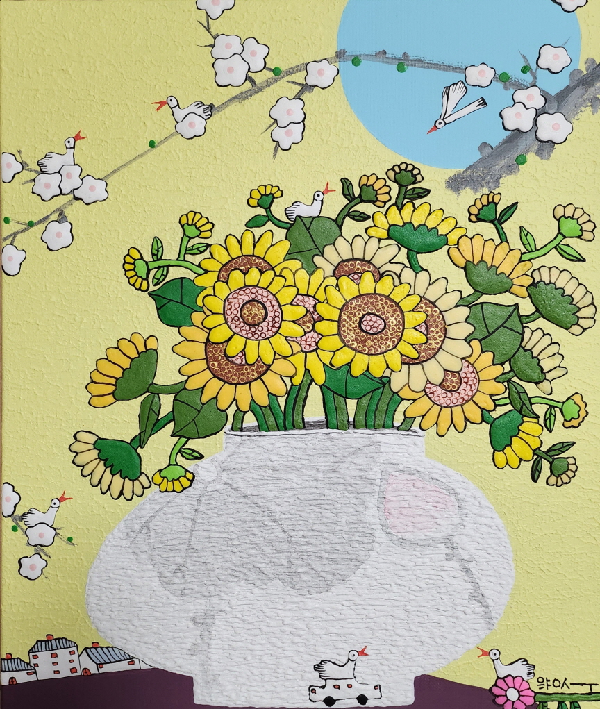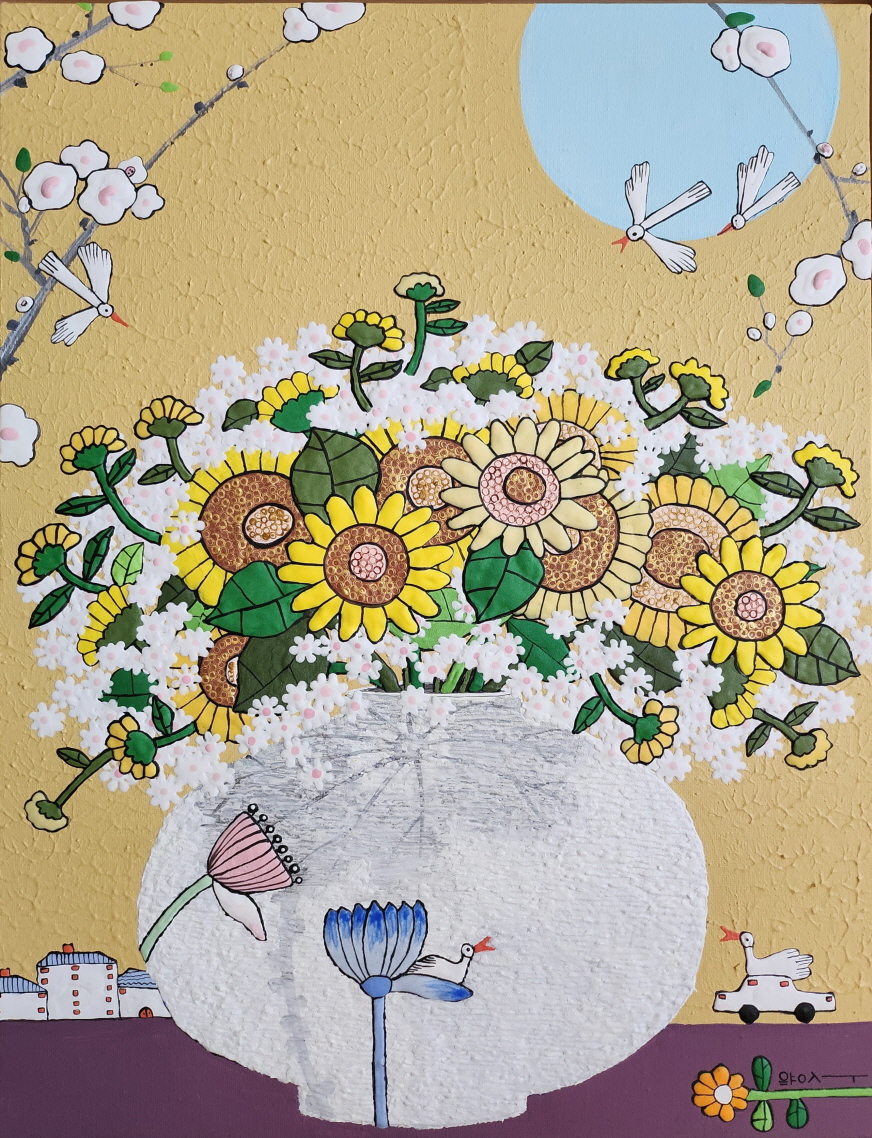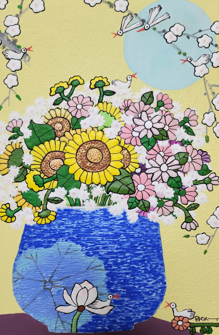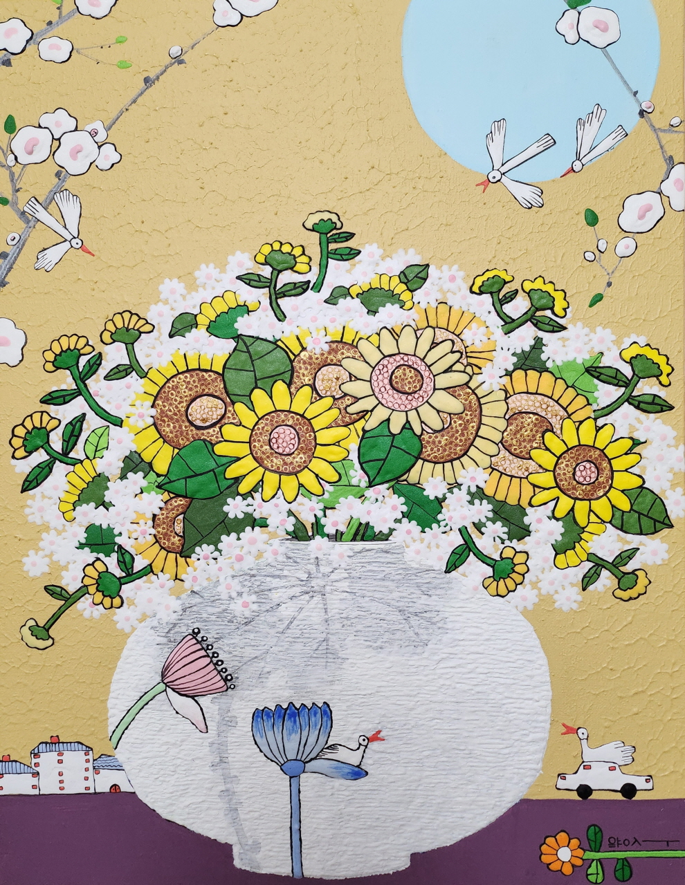 권향수 개인전 및 단체전 경력 <개인전및초대전>23회 2024 9월1일~30일 3s 갤러리 초대전 2024. 1월10 일~29일 돈화문갤러리초대전 2023.9월1일-9월30일 서울 3s갤러리 초대전 2023.5.1~5.31 고양시 백석 앨리 갤러리 초대전 2022 7.19~8.6하남시 갤러리베누스 초대전 2022..1.21~1.28서울아산병원초대전 2020.05 분당 보바스기념병원 초대전 2019.08 서울아산병원갤러리 초대개인전 2018.03 미국중앙일보 LA지사 Artcenter 초대전 외 단체전 다수 부산 대구 홍콩 프랑스 브라질 미국 인도 중국 국내외아트페어 다수 현대조형미술대전운영위원심사위원 경기미술대전운영위원및심사위원외다수 -작가노트- 우연히 밤하늘에 둥근달을 보게 되면 습관처럼 잠깐 소원을 빌게 된다. 어릴 적 보름날밤 가마솥 안 그릇에 쌀을 담아 촛불 켜시던 어머니의 정성이 고스란히 담은 깊은 사랑이었던걸 내 아이들을 키우면서 점점 더 닮아간다. 세상의 엄마들이 다 그러하듯이- 어머니의 눈빛이 내 얼굴에 담겨지고, 그 옛날 꿈꾸던 추억을 더 곱고 순박하게 표현하고 싶었다. 어머니의 둥근 달, 지천으로 피어있는 해바라기와 키 작은 꽃들- 착한 집들이 소담히 마주하고, 희망과 사랑을 노래하는 작은 새는 어쩌면 부부, 연인, 자녀 일수도.... 나의 그림은 인연이 되어 만나는 모든 사물들을 형상화하여 소박한 민화 느낌으로 단순하게, 자유롭게, 조금은 모자란 듯 표현하고자 했다. 어머니가 나에게 그랬듯이 내가 내 딸(아이들)에게 최고의 아름다움과 소중하고 귀한 행복한마음이 내 작품을 보는 사람들에게 한 보따리선물 되어 잠시나마 추억과 희망의 메시지가 전달되어 행복하고 여유로운 미소가 번지기를 소망해본다.