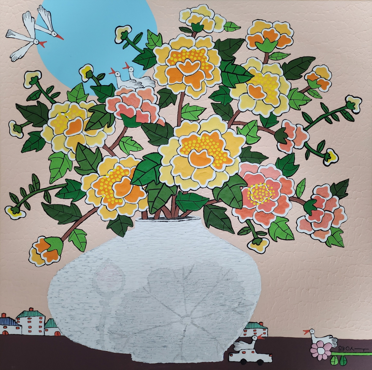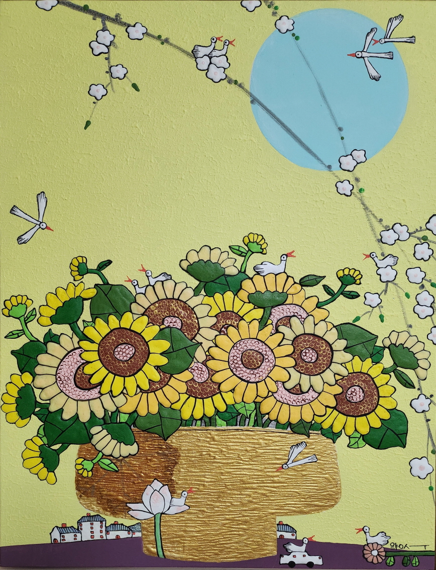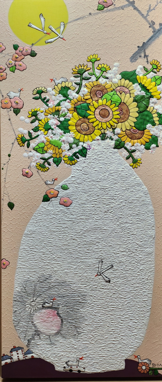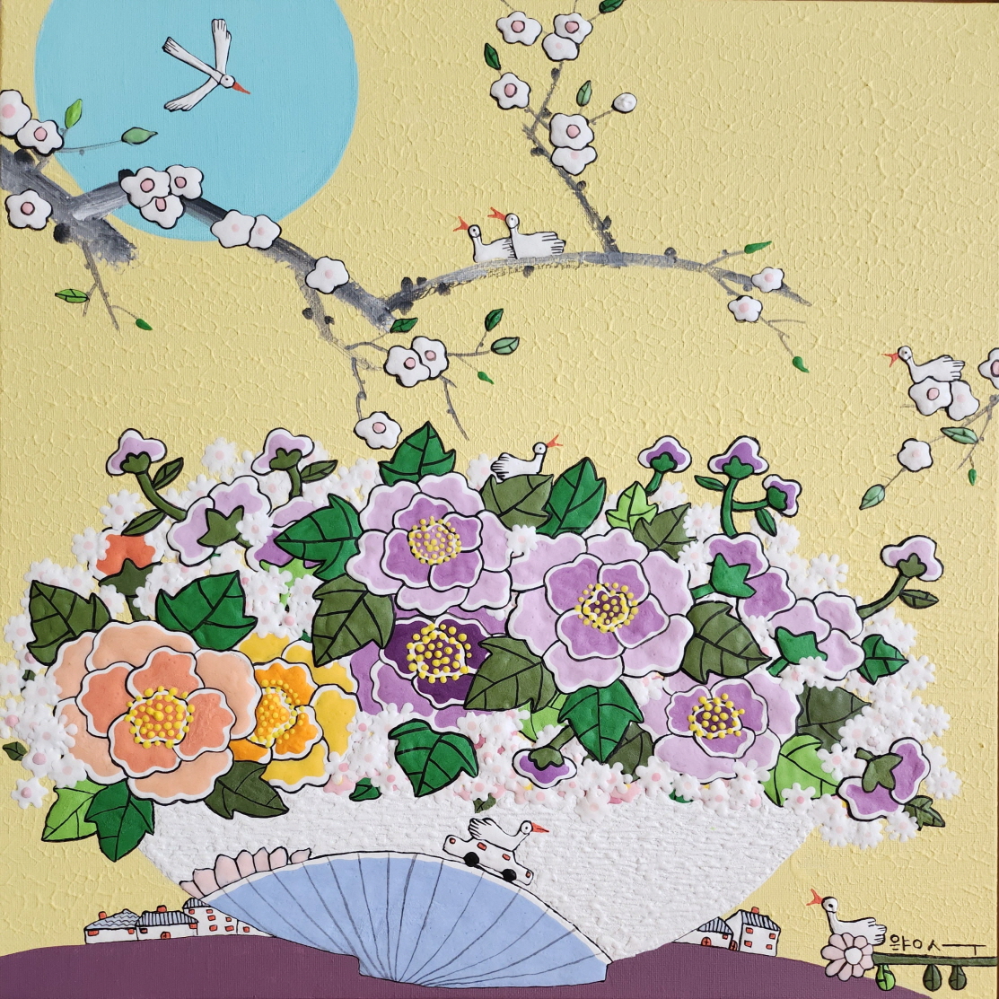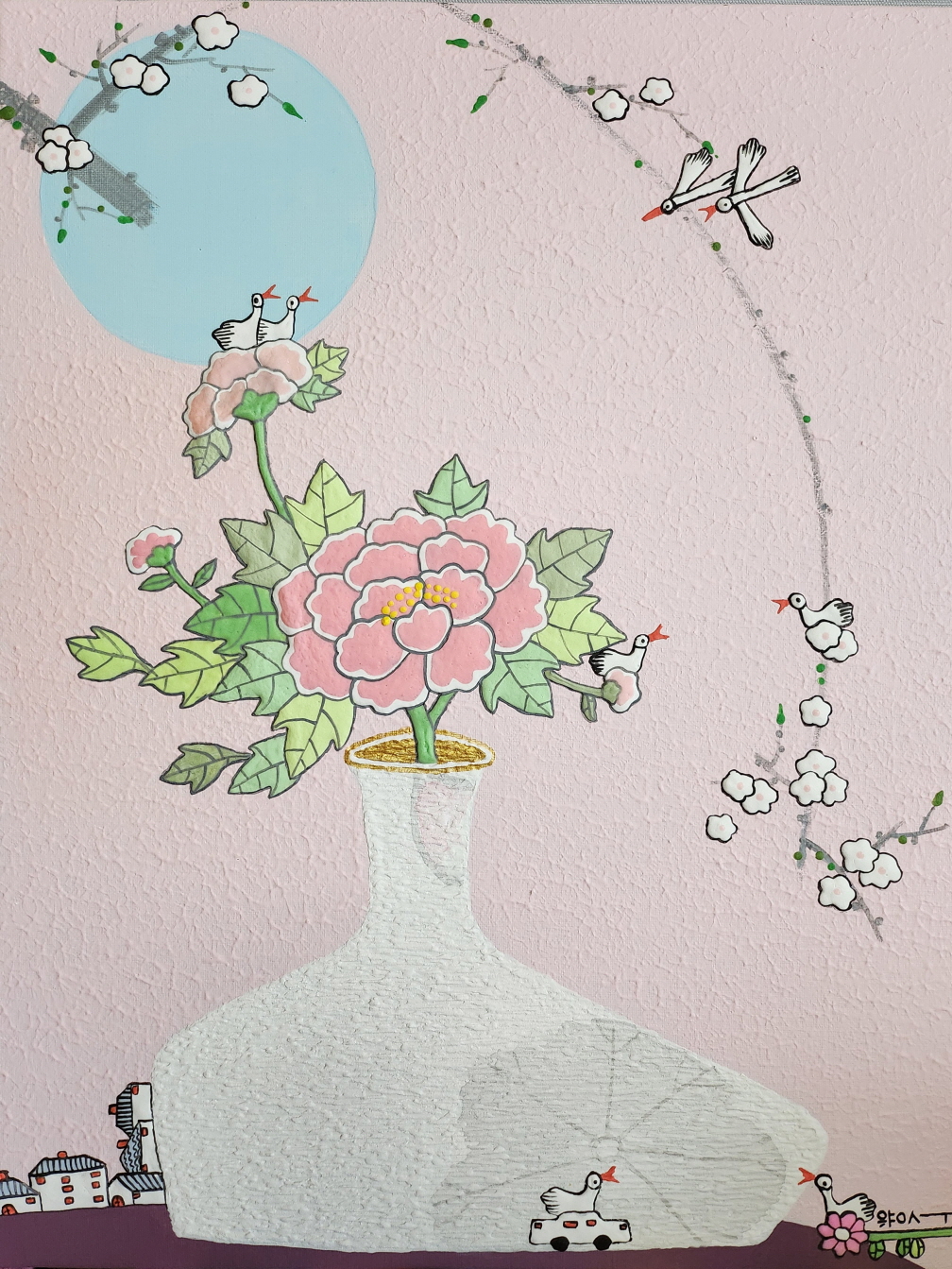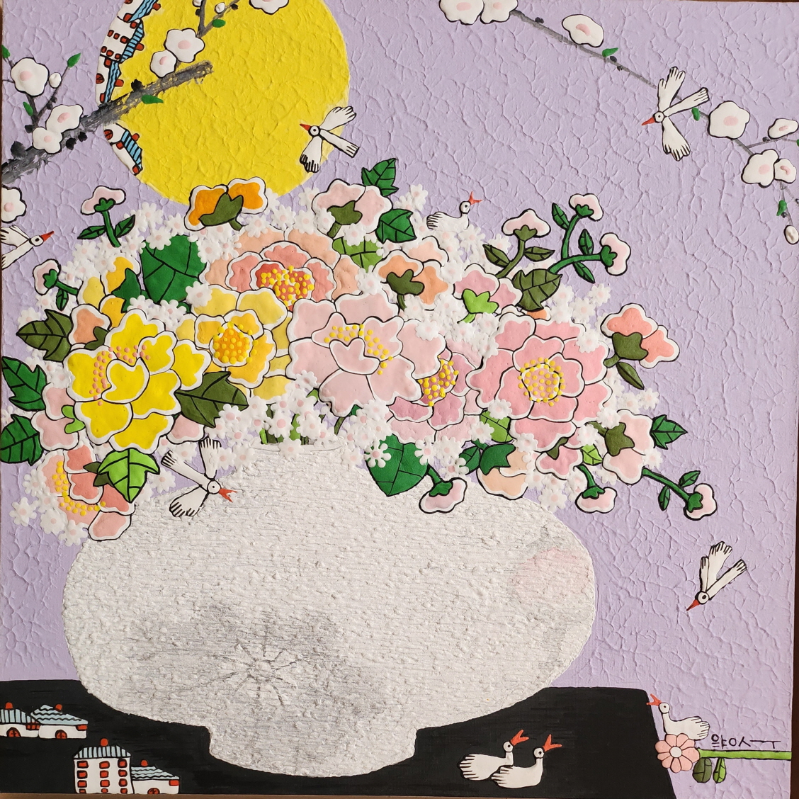 권향수 개인전 및 단체전 경력 <개인전및초대전>23회 2024 9월1일~30일 3s 갤러리 초대전 2024. 1월10 일~29일 돈화문갤러리초대전 2023.9월1일-9월30일 서울 3s갤러리 초대전 2023.5.1~5.31 고양시 백석 앨리 갤러리 초대전 2022 7.19~8.6하남시 갤러리베누스 초대전 2022..1.21~1.28서울아산병원초대전 2020.05 분당 보바스기념병원 초대전 2019.08 서울아산병원갤러리 초대개인전 2018.03 미국중앙일보 LA지사 Artcenter 초대전 외 단체전 다수 부산 대구 홍콩 프랑스 브라질 미국 인도 중국 국내외아트페어 다수 현대조형미술대전운영위원심사위원 경기미술대전운영위원및심사위원외다수 -작가노트- 우연히 밤하늘에 둥근달을 보게 되면 습관처럼 잠깐 소원을 빌게 된다. 어릴 적 보름날밤 가마솥 안 그릇에 쌀을 담아 촛불 켜시던 어머니의 정성이 고스란히 담은 깊은 사랑이었던걸 내 아이들을 키우면서 점점 더 닮아간다. 세상의 엄마들이 다 그러하듯이- 어머니의 눈빛이 내 얼굴에 담겨지고, 그 옛날 꿈꾸던 추억을 더 곱고 순박하게 표현하고 싶었다. 어머니의 둥근 달, 지천으로 피어있는 해바라기와 키 작은 꽃들- 착한 집들이 소담히 마주하고, 희망과 사랑을 노래하는 작은 새는 어쩌면 부부, 연인, 자녀 일수도.... 나의 그림은 인연이 되어 만나는 모든 사물들을 형상화하여 소박한 민화 느낌으로 단순하게, 자유롭게, 조금은 모자란 듯 표현하고자 했다. 어머니가 나에게 그랬듯이 내가 내 딸(아이들)에게 최고의 아름다움과 소중하고 귀한 행복한마음이 내 작품을 보는 사람들에게 한 보따리선물 되어 잠시나마 추억과 희망의 메시지가 전달되어 행복하고 여유로운 미소가 번지기를 소망해본다.
