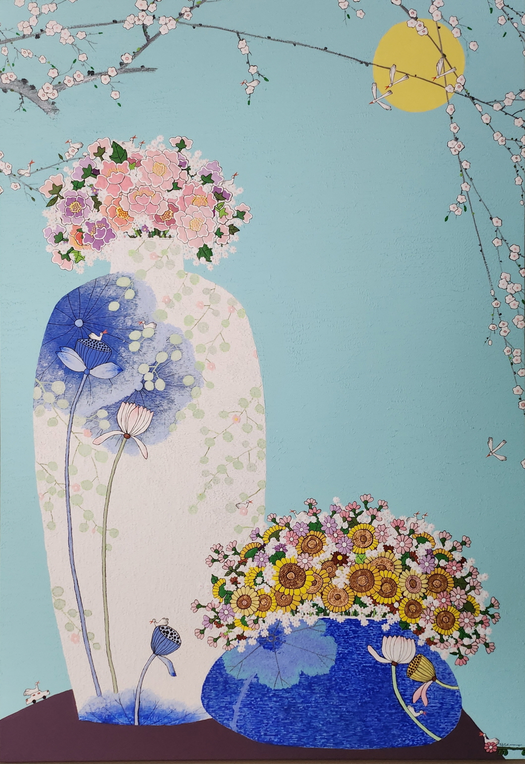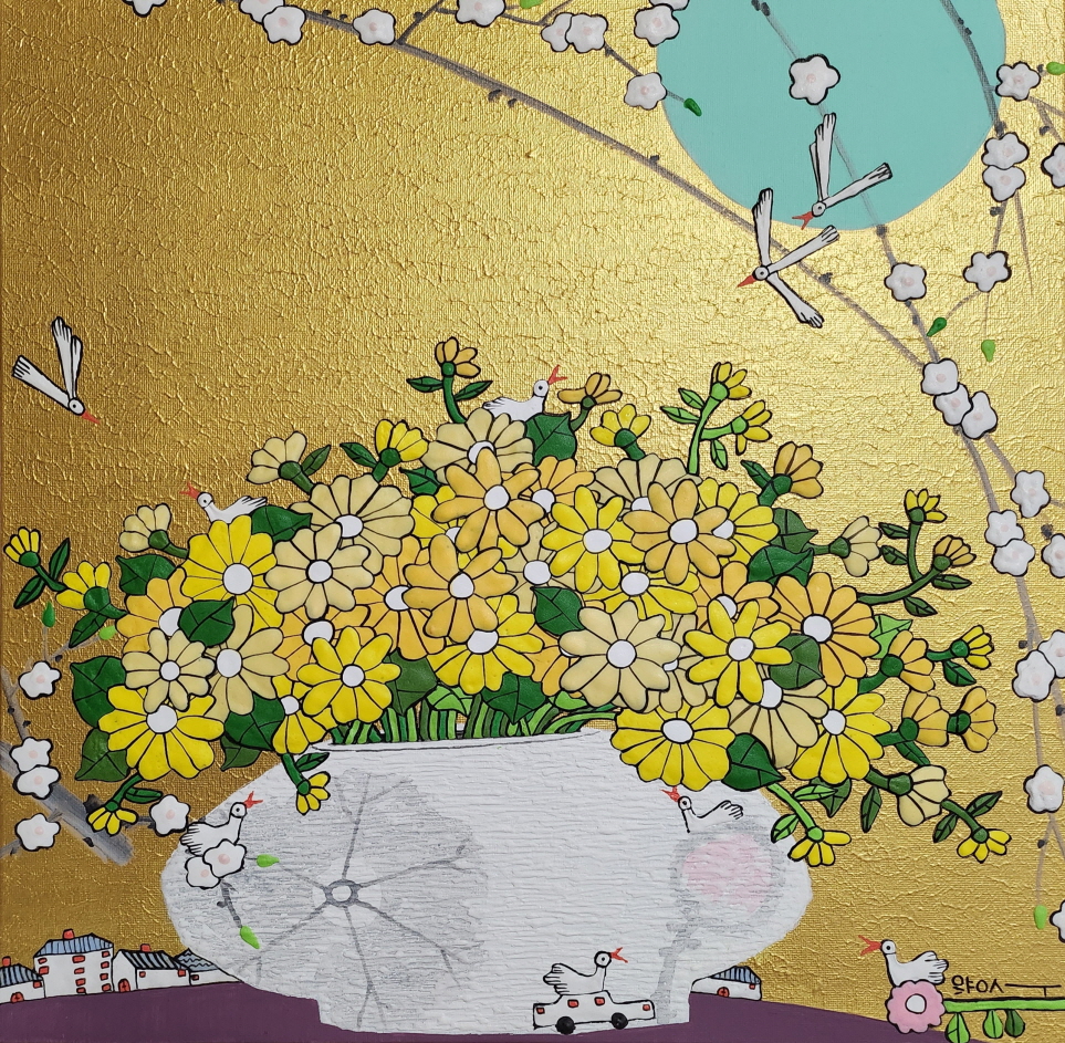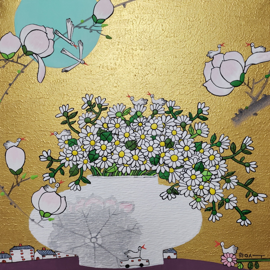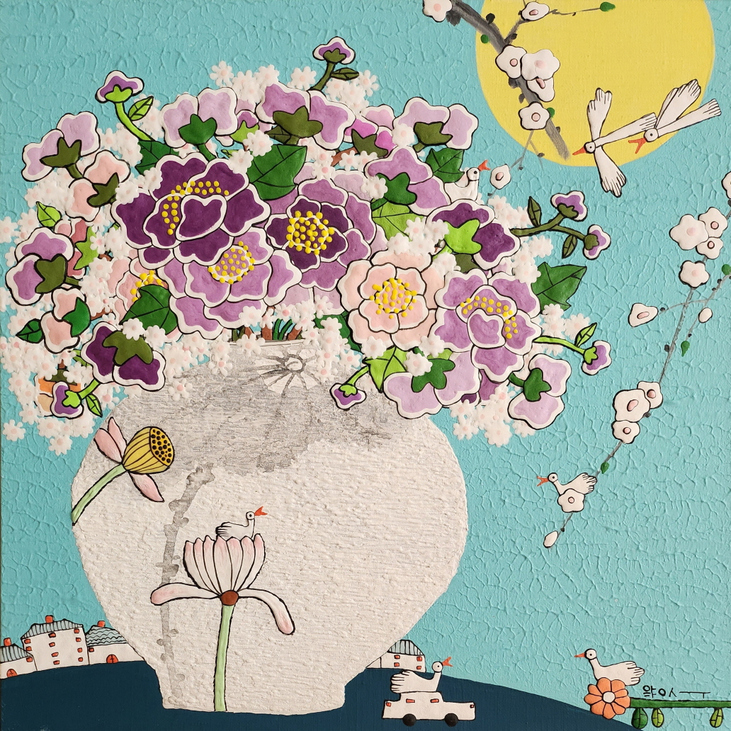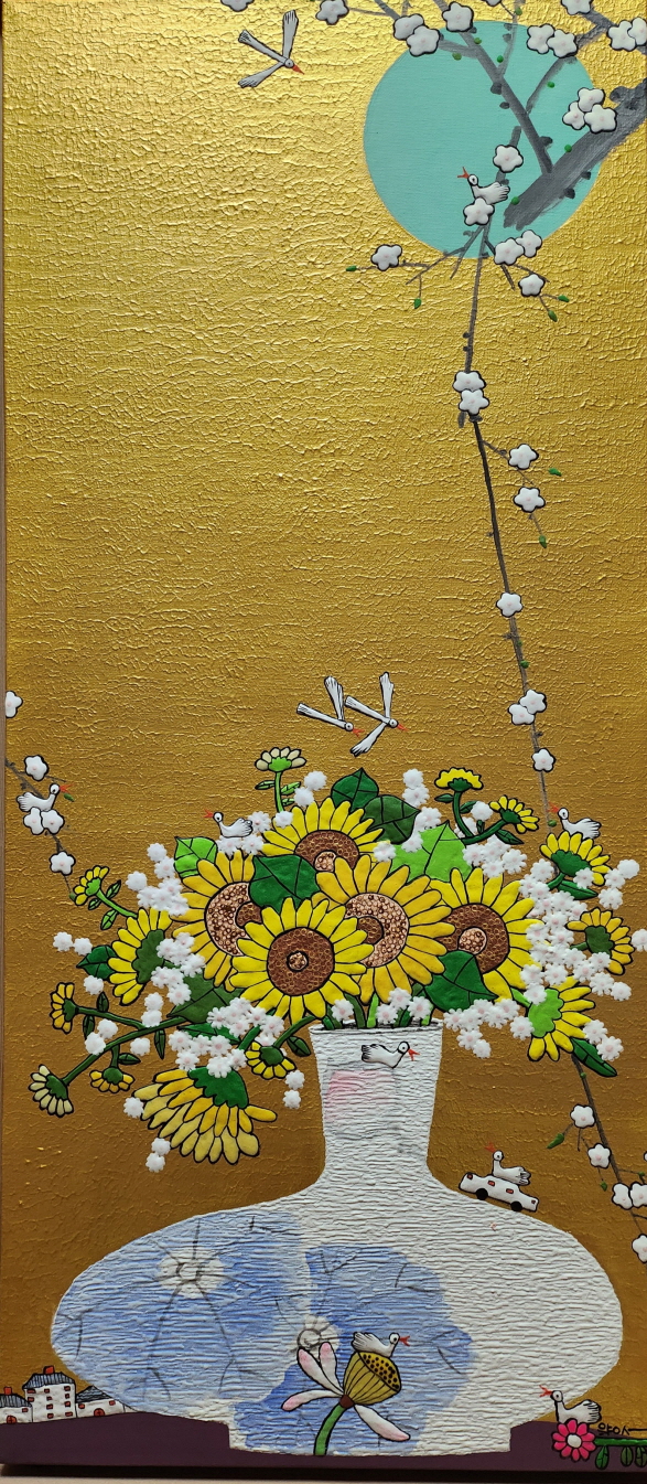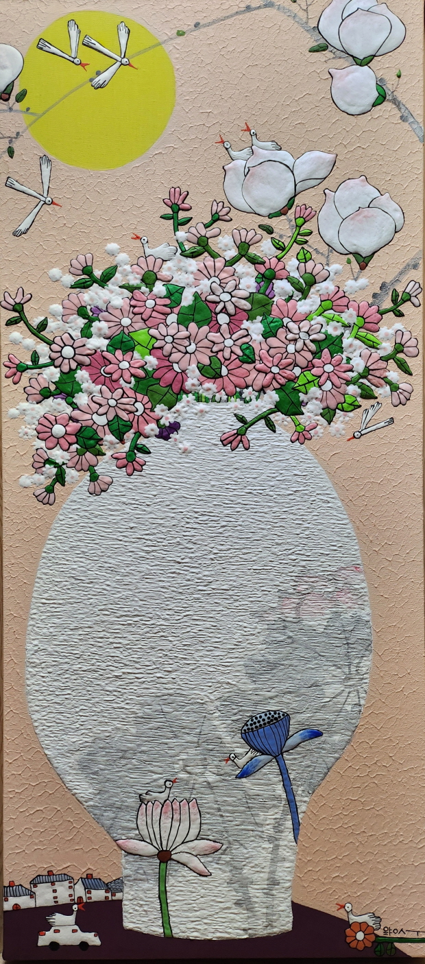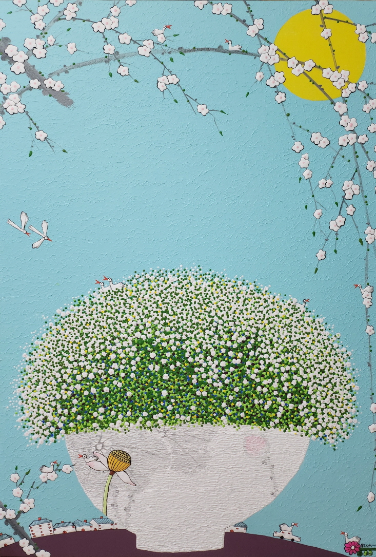 권향수 개인전 및 단체전 경력 <개인전및초대전>23회 2024 9월1일~30일 3s 갤러리 초대전 2024. 1월10 일~29일 돈화문갤러리초대전 2023.9월1일-9월30일 서울 3s갤러리 초대전 2023.5.1~5.31 고양시 백석 앨리 갤러리 초대전 2022 7.19~8.6하남시 갤러리베누스 초대전 2022..1.21~1.28서울아산병원초대전 2020.05 분당 보바스기념병원 초대전 2019.08 서울아산병원갤러리 초대개인전 2018.03 미국중앙일보 LA지사 Artcenter 초대전 외 단체전 다수 부산 대구 홍콩 프랑스 브라질 미국 인도 중국 국내외아트페어 다수 현대조형미술대전운영위원심사위원 경기미술대전운영위원및심사위원외다수 -작가노트- 우연히 밤하늘에 둥근달을 보게 되면 습관처럼 잠깐 소원을 빌게 된다. 어릴 적 보름날밤 가마솥 안 그릇에 쌀을 담아 촛불 켜시던 어머니의 정성이 고스란히 담은 깊은 사랑이었던걸 내 아이들을 키우면서 점점 더 닮아간다. 세상의 엄마들이 다 그러하듯이- 어머니의 눈빛이 내 얼굴에 담겨지고, 그 옛날 꿈꾸던 추억을 더 곱고 순박하게 표현하고 싶었다. 어머니의 둥근 달, 지천으로 피어있는 해바라기와 키 작은 꽃들- 착한 집들이 소담히 마주하고, 희망과 사랑을 노래하는 작은 새는 어쩌면 부부, 연인, 자녀 일수도.... 나의 그림은 인연이 되어 만나는 모든 사물들을 형상화하여 소박한 민화 느낌으로 단순하게, 자유롭게, 조금은 모자란 듯 표현하고자 했다. 어머니가 나에게 그랬듯이 내가 내 딸(아이들)에게 최고의 아름다움과 소중하고 귀한 행복한마음이 내 작품을 보는 사람들에게 한 보따리선물 되어 잠시나마 추억과 희망의 메시지가 전달되어 행복하고 여유로운 미소가 번지기를 소망해본다.