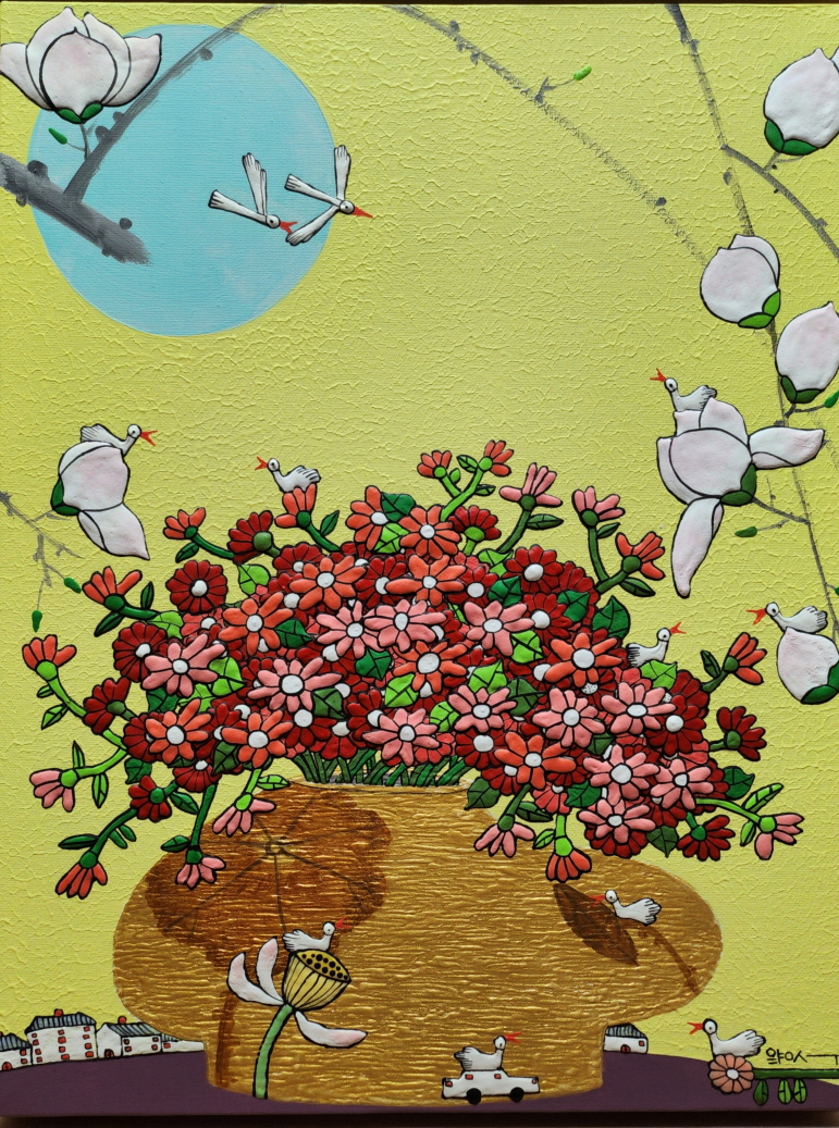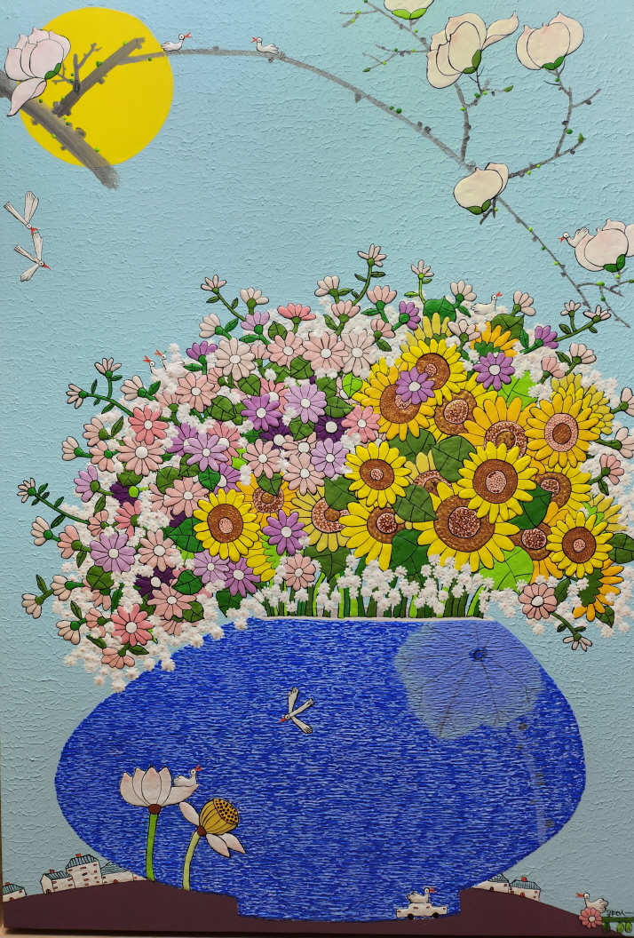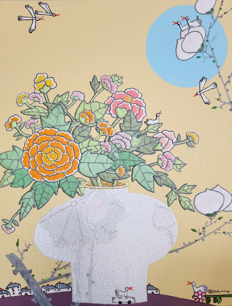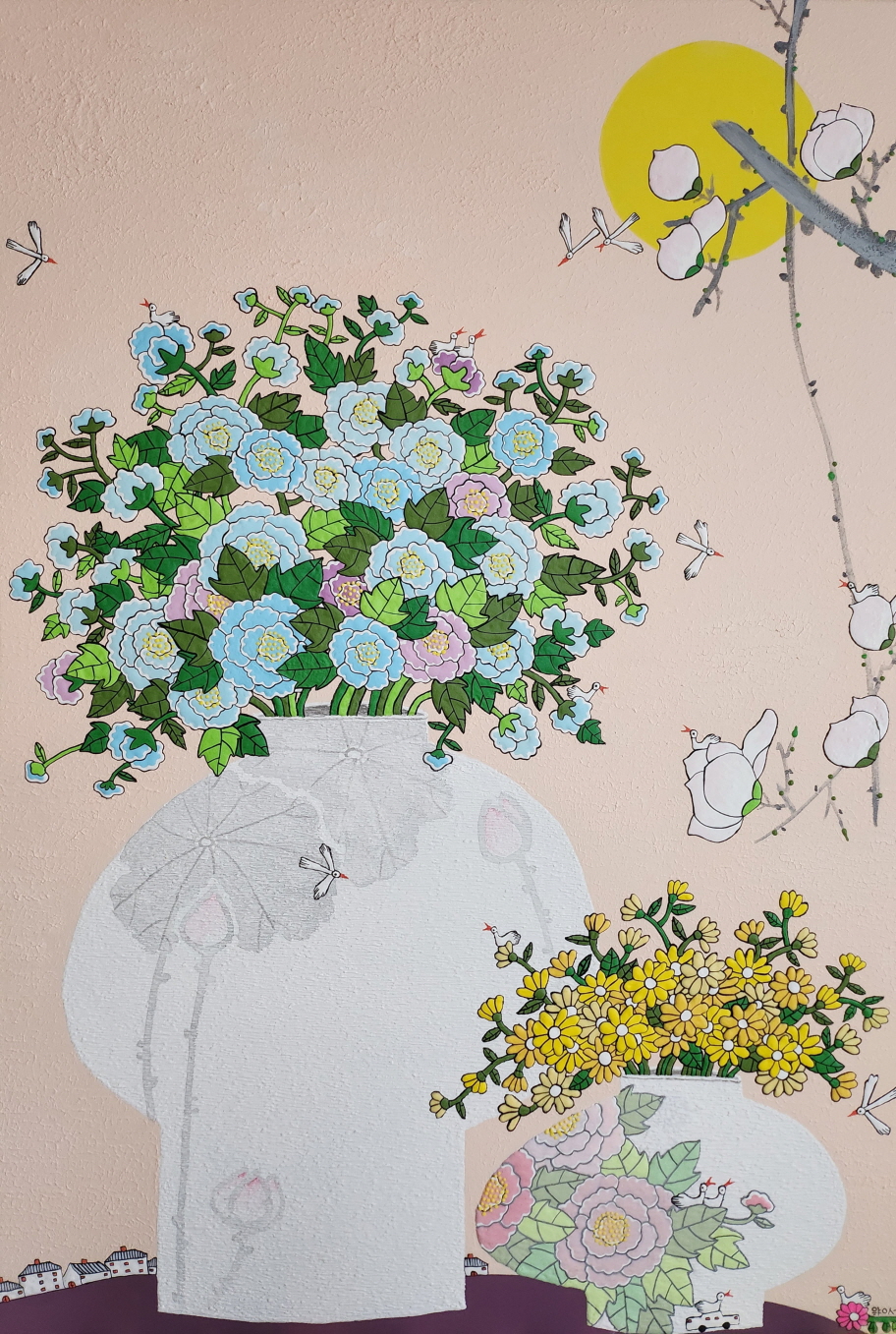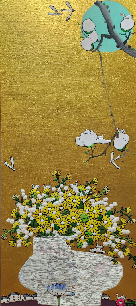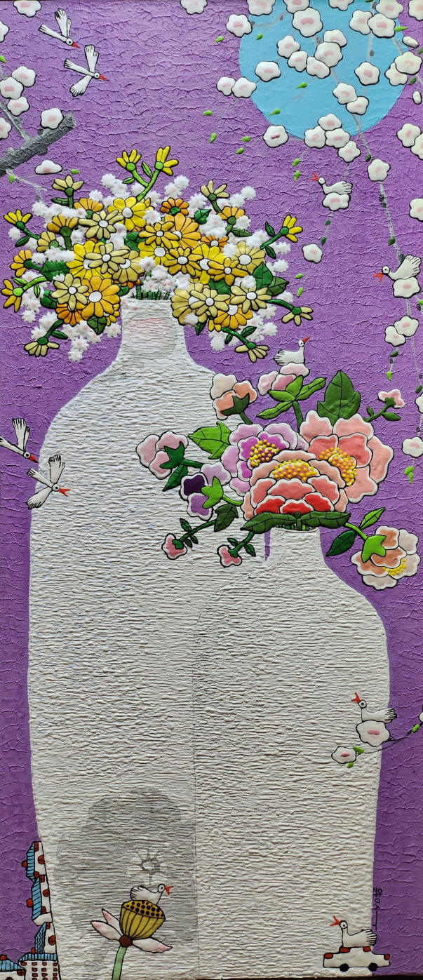 권향수 개인전 및 단체전 경력 <개인전및초대전>23회 2024 9월1일~30일 3s 갤러리 초대전 2024. 1월10 일~29일 돈화문갤러리초대전 2023.9월1일-9월30일 서울 3s갤러리 초대전 2023.5.1~5.31 고양시 백석 앨리 갤러리 초대전 2022 7.19~8.6하남시 갤러리베누스 초대전 2022..1.21~1.28서울아산병원초대전 2020.05 분당 보바스기념병원 초대전 2019.08 서울아산병원갤러리 초대개인전 2018.03 미국중앙일보 LA지사 Artcenter 초대전 외 단체전 다수 부산 대구 홍콩 프랑스 브라질 미국 인도 중국 국내외아트페어 다수 현대조형미술대전운영위원심사위원 경기미술대전운영위원및심사위원외다수 -작가노트- 우연히 밤하늘에 둥근달을 보게 되면 습관처럼 잠깐 소원을 빌게 된다. 어릴 적 보름날밤 가마솥 안 그릇에 쌀을 담아 촛불 켜시던 어머니의 정성이 고스란히 담은 깊은 사랑이었던걸 내 아이들을 키우면서 점점 더 닮아간다. 세상의 엄마들이 다 그러하듯이- 어머니의 눈빛이 내 얼굴에 담겨지고, 그 옛날 꿈꾸던 추억을 더 곱고 순박하게 표현하고 싶었다. 어머니의 둥근 달, 지천으로 피어있는 해바라기와 키 작은 꽃들- 착한 집들이 소담히 마주하고, 희망과 사랑을 노래하는 작은 새는 어쩌면 부부, 연인, 자녀 일수도.... 나의 그림은 인연이 되어 만나는 모든 사물들을 형상화하여 소박한 민화 느낌으로 단순하게, 자유롭게, 조금은 모자란 듯 표현하고자 했다. 어머니가 나에게 그랬듯이 내가 내 딸(아이들)에게 최고의 아름다움과 소중하고 귀한 행복한마음이 내 작품을 보는 사람들에게 한 보따리선물 되어 잠시나마 추억과 희망의 메시지가 전달되어 행복하고 여유로운 미소가 번지기를 소망해본다.