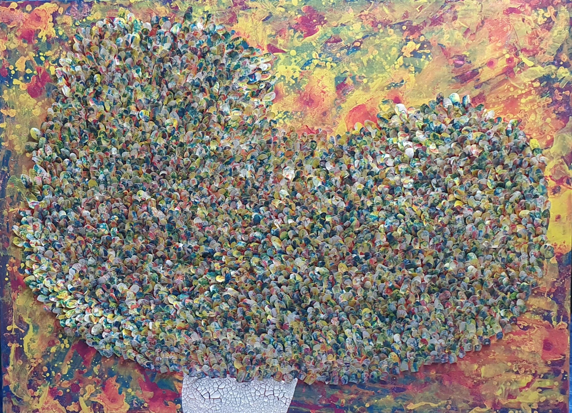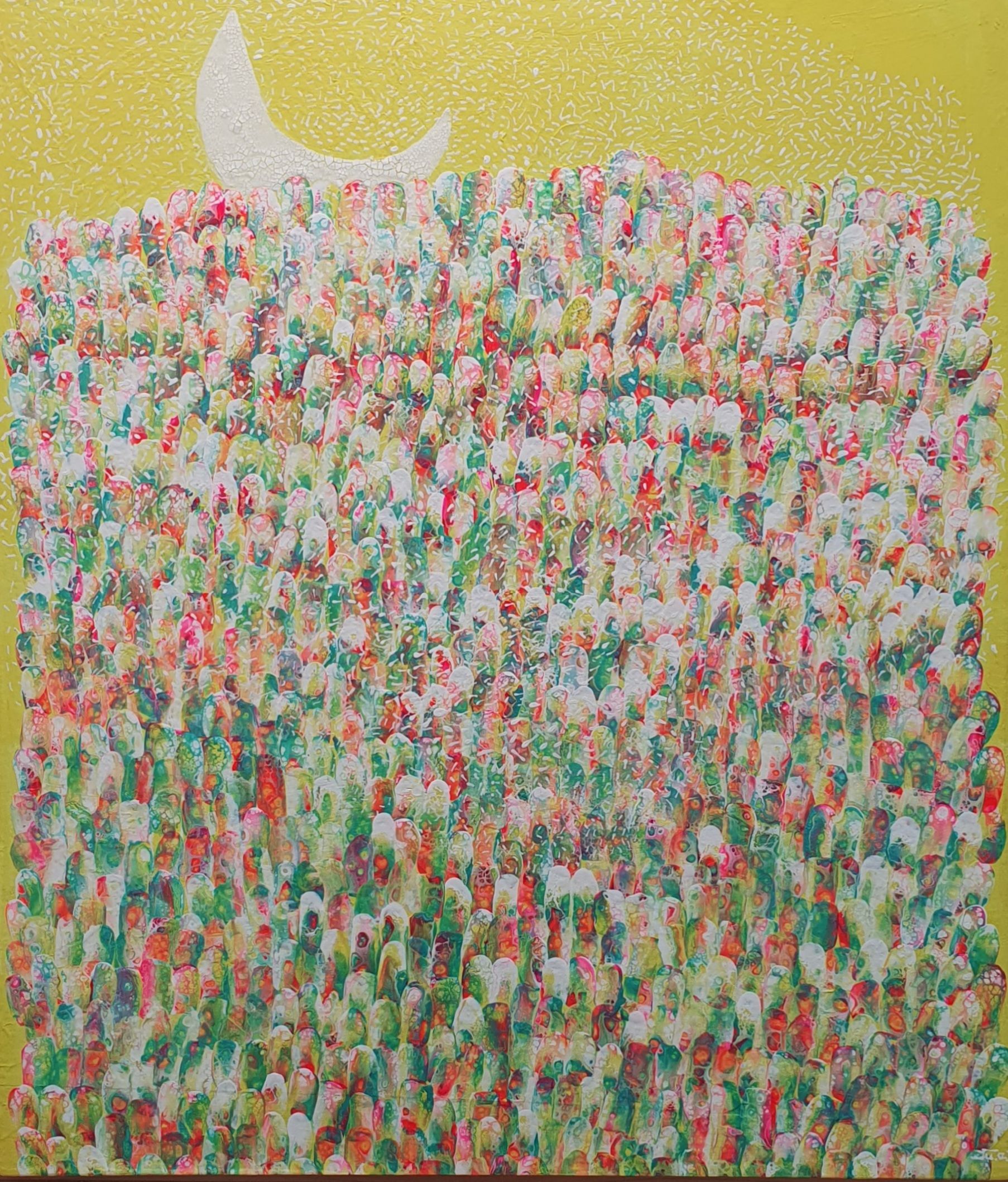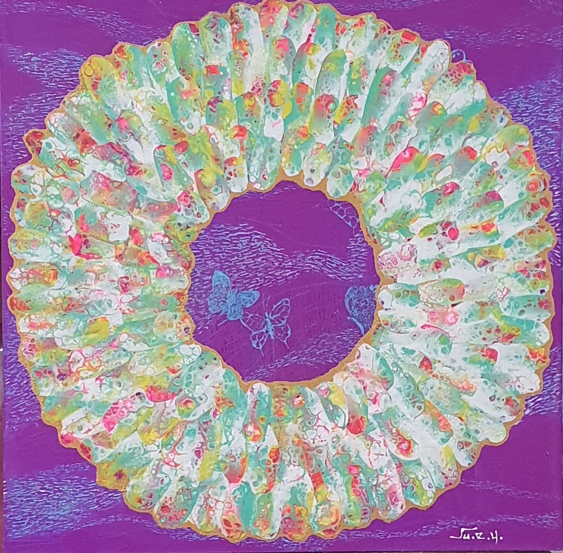 주은영 Ju eun young 전화: 010-8923-3642 (개인전 21회) AP갤러리 초대전 노원문화원 기획초대전 경춘선숲길갤러리(공모당선초대전) 도솔미술관 개인전 로쉬갤러리 초대전 인사아트프라자갤러리 개인전 콩세유 갤러리 한가람 갤러리 도봉갤러리 초대전 등 서울아트쇼 제주아트페스타 부산화랑아트페어 BAMA 조형아트쇼PLAS 싱가폴아트페어 홍콩WHATS 대구아트쇼 등 국내외 아트페어 및 단체전 220여회 현 사단법인 국제현대예술협회 인사동사람들 사무총장 인사국제아트페어 사무총장 한국미술협회 녹색미술협회 노원미술협회 노원문화재단 104마을 예술창작소 입주작가(2018~2024) -작가노트- 나의 작품들은 유동적이고 자연스러운 패턴을 통해 화면 전체에 리드미컬한 구성감을 제공하려고 시도하였다. 배경의 텍스처와 레이어링 콜라주 기법은 화면의 전경(Foreground)과 배경(Background)을 명확히 분리하면서도 유기적인 연결성을 유지하면서 불규칙하게 배치하여 비대칭적 구성을 이뤄 역동성을 강조했다. 또한 다양한 색채와 톤을 활용하여 깊이감과 공간감 그리고 균형감을 효과적으로 구현하려고 하였다. 작품 전반에 흐르는 색채의 조화는 정적이면서도 생동감 있는 이중적 감정을 전달한다. Fluid Art 기법에서 나타나는 셀(Cell) 효과와 유동적 물감 흐름의 텍스처는 화면에 독특한 시각적 요소를 제공하고 매끄러운 배경과 대비되는 콜라쥬 피스의 입체적 질감은 작품의 촉각적 특성을 강화하며, 시각적 긴장감을 조성한다. 각 피스들을 Layering하여 공간적 깊이와 입체감을 극대화했다. 이런 변화와 조화의 개별적 요소가 모여 하나의 전체를 구성하는 방식은 다양성과 통합의 개념을 암시한다. Fluid Art의 즉흥성과 레이어링 기법의 계획성이 결합되어, 조화와 대립이라는 미적 긴장을 창출하고 독창적인 시각적 쾌감을 제공하려고 하였다 그리하여 관람자로 하여금 작품을 단순히 시각적으로 감상하는 것을 넘어 내면의 고요함을 탐구하게 하며, 명상적이며 차분하고 신비로운 느낌과 생동감 넘치고 활기가 느껴지게 하고 싶었다. 다채로운 색감과 질감이 마치 자연의 에너지와 연결된 듯하고, 생명이 약동하는 듯한 느낌을 담고 싶었다. 작품에 주로 등장하는 달은 감정과 기억의 흐름, 끝없이 순환하는 이야기의 본질, 상실과 회복을 희망을 상징하며 씨앗은 이야기의 가능성과 확산, 누군가에게 전해질 서사의 잠재력을 달은 바람과 꿈, 소망과 회상의 공간을 의미한다. 어지러운 절망과 아픔들이 휘몰아치는 이즈음에도 함께 손 모아 달에 소원을 빌고 서로의 소망에 귀 기울여주고 싶은 마음를 담아 이 작품을 준비하였다.
