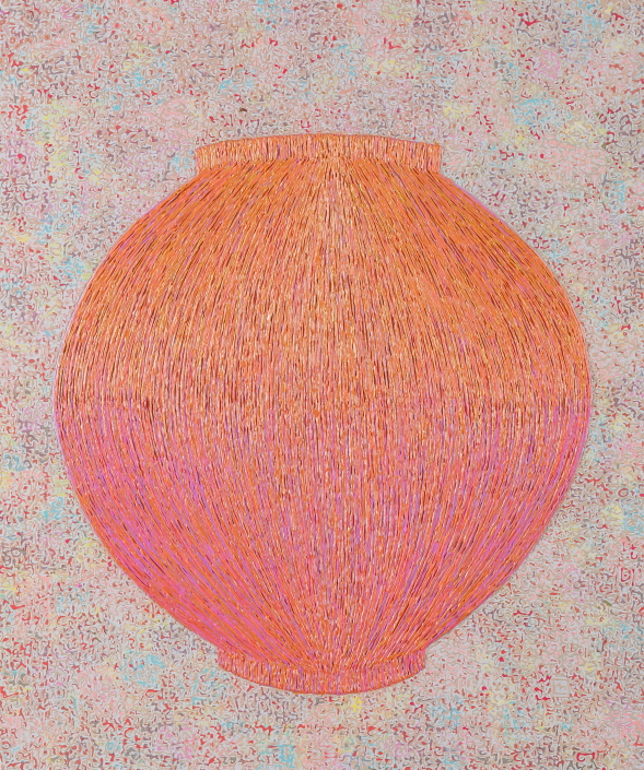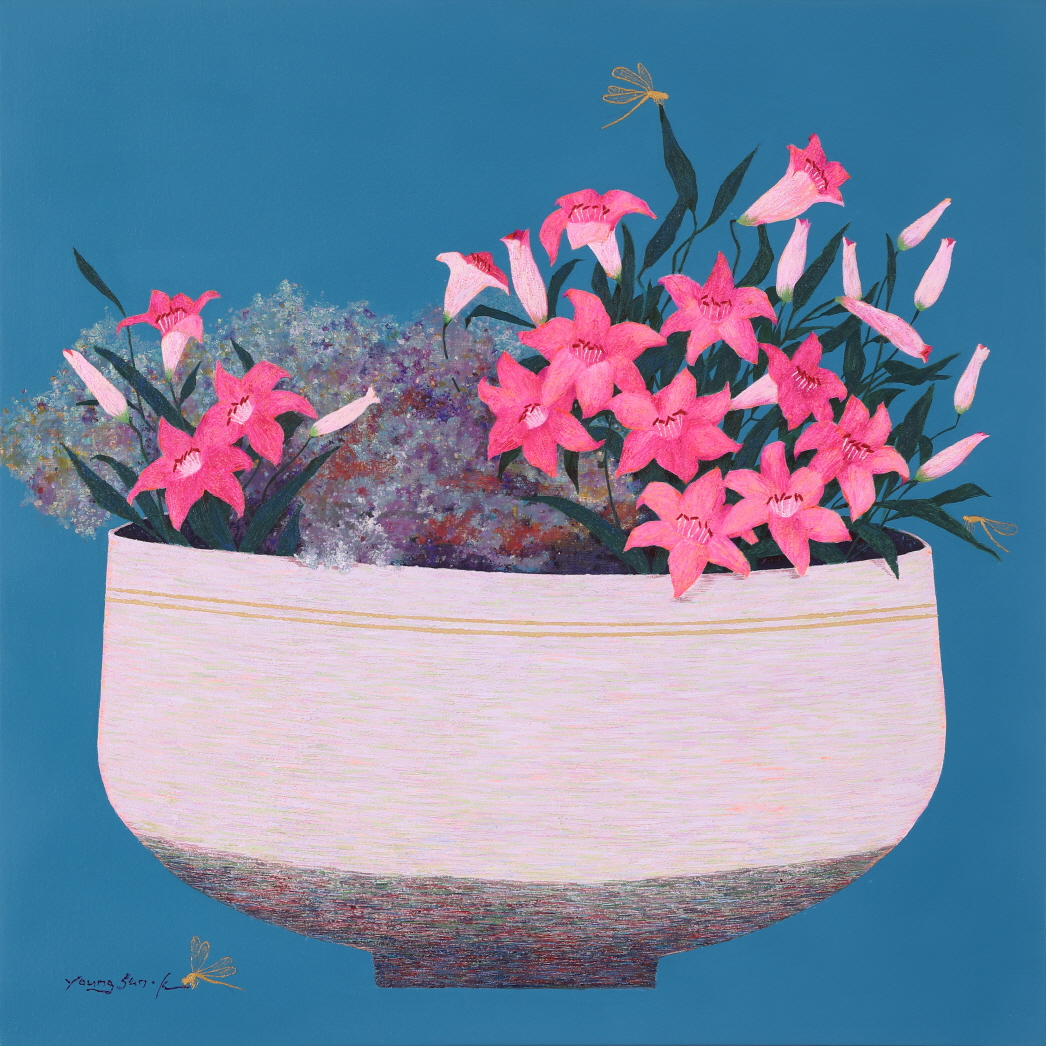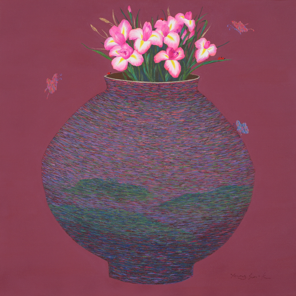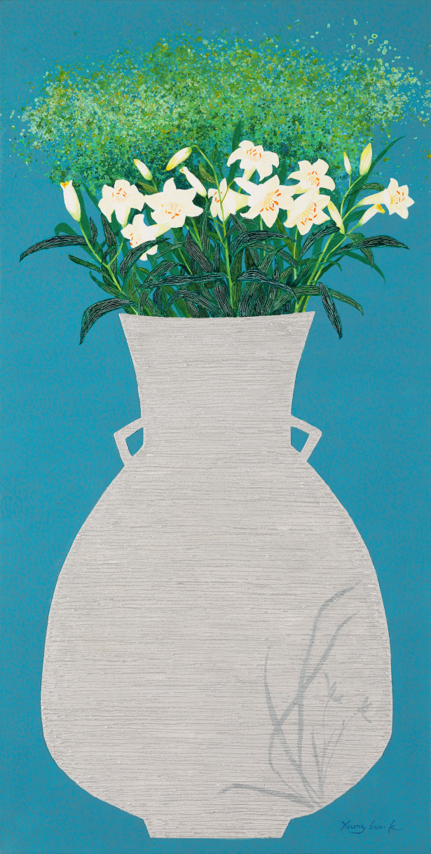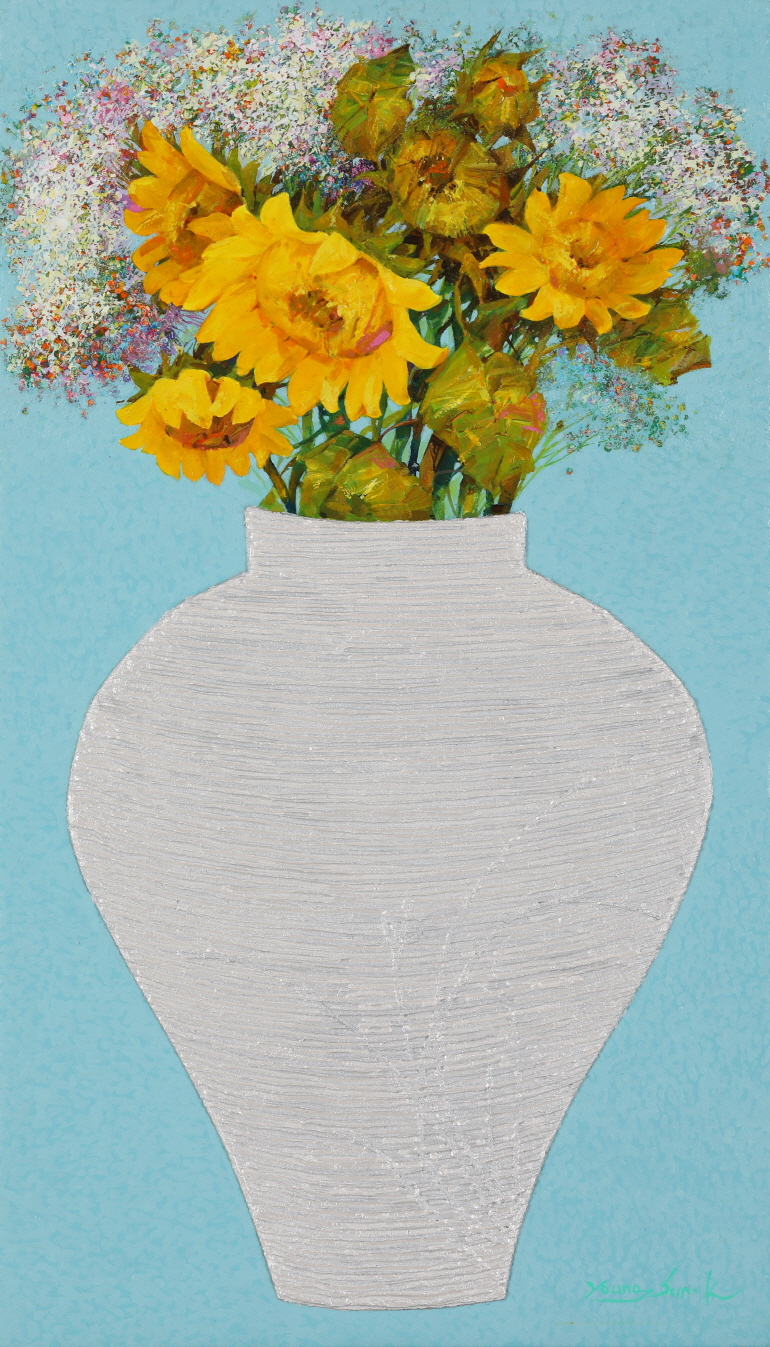 김영선 화가 작가노트 ‘달항아리(Moonjar)’를 통한 마음의 평화 긴긴 세월이 흘러서 이제는 기억도 아스라한 어느 해 8월, 그해 여름의 뜨거운 햇살이 좁은 골목 안을 가득 채울 때, 나는 담장 밖의 고개 숙여 외롭게 홀로 서 있는 키 큰 해바라기를 떠올리면서 화가의 꿈을 꾸었고, 활동 초기에는 작품 소재의 다양성과 색채의 대비를 추구하고, 긴장감을 끌어내기 위한 구성법으로 색채의 밀도와 붓놀림을 작품의 소재에 어울리도록 하기 위한 완급의 조율에 각별하게 노력을 기울여 왔다. 따라서 내 작품에 나타난 색채는 내 감성과 이성이 저 마음의 심연에서부터 무언가를 순간적으로 떠올려 영감을 주는 그런 색감으로 구성되어 있으며. 즉흥적 테크닉의 사용은 지양(止揚)하고, 충분한 혼색(混色)으로 소재가 갖는 특성을 살리고자 치밀한 계획을 세워 접근하였다. 하지만 작품 활동을 시작하고 수십 년 세월이 흐른 지금에 이르러, 나의 예술세계는 다양한 소재보다는 ‘달(Moon)과 항아리(Jar)’라고 하는 토속적이면서 동양적이고 동시에 세계성(Globality)도 담고 있는 특정 소재에 천착(穿鑿)하게 되었고, ‘달’과 ‘항아리’가 풍기는 따듯함과 부드러움의 조화를 통해, 내 작품을 감상하는 이들에게 고향에 대한 그리움과 어릴적 추억을 통한 마음의 평화를 주기 위해 노력하고 있다. AI(Artificial Intelligence) 등의 최첨단 기술까지 작품 활동에 응용하는 미술계의 변화무쌍한 흐름이 ‘급속한 환경 변화 때문에 심신이 지쳐가는 현대인의 불안감을 더욱 증폭시키는 것은 아닌가?’라는 생각으로 나는 내 작품의 주제인 ‘달’과 ‘항아리’ 그리고 이 2가지를 합한 ‘달항아리(Moon Jar)’를 통해 현대인들에게 ‘달’의 온기와 ‘항아리’의 부드러움을 선물하고, 그들이 나의 작품에 매력과 호기심을 갖도록 도자성(陶瓷性) 화풍에 색채를 담아내고, 심미안(審美眼)의 능력을 길러, 세상 사람에게 행복과 향기를 전달하고자 오늘도 나는 ‘물감 놀이’를 즐기고 있다